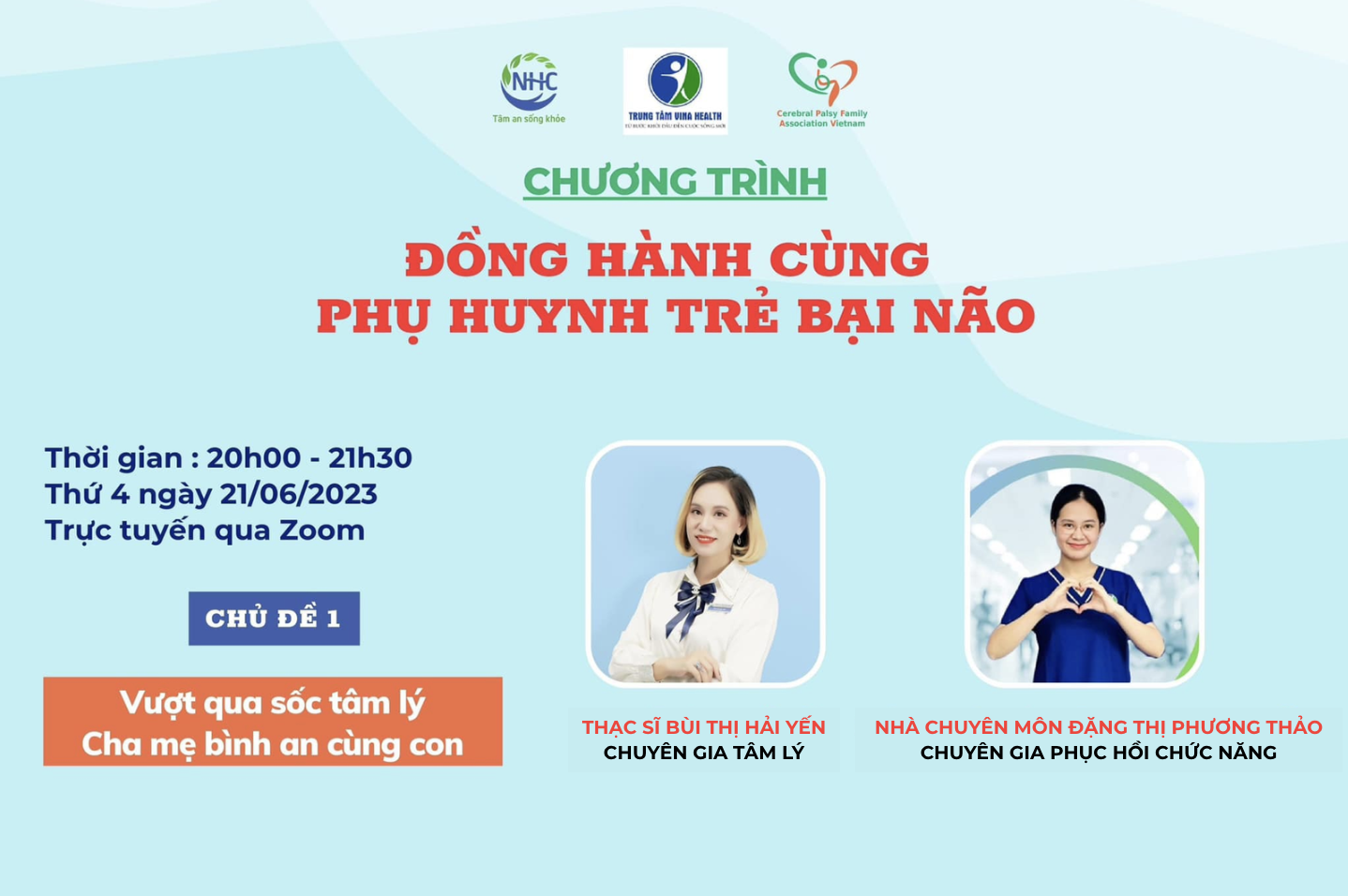Thấu hiểu được những điều đó, đại diện Viện Nghiên cứu Tâm lý và Phát triển Con người, Trung tâm Tâm lý và Phát triển Con người NHC Việt Nam đơn vị số 1 về hỗ trợ tư vấn giải quyết vấn đề tâm lý không dùng thuốc tại Việt Nam đã phối hợp cùng Hội Gia đình trẻ bại não Việt Nam (CPFAV) và Trung tâm Phục Hồi Chức Năng VinaHealth tổ chức chuỗi chương trình “Đồng hành cùng phụ huynh trẻ bại não”.